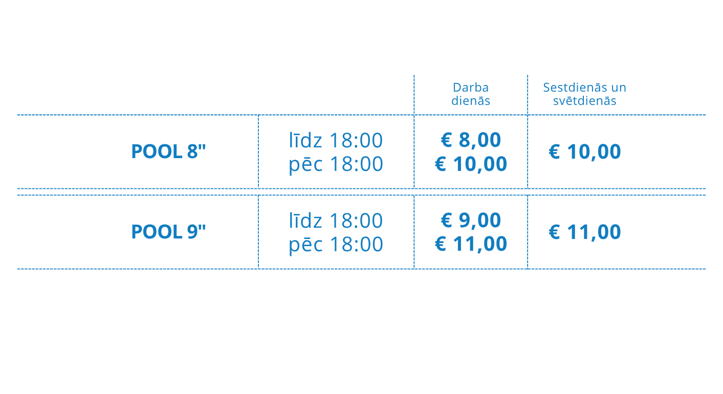 Lai saņemtu biljarda spēlēšanai nepieciešamo inventāru, jāiemaksā drošības nauda € 10,00 apmērā! Tikai skaidrā naudā!